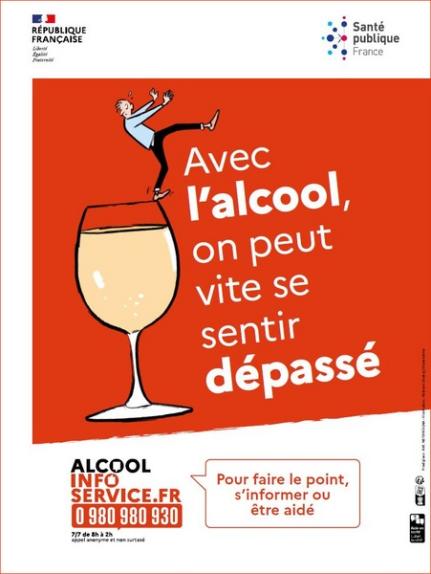 Affiche illustrée au format 30x40 cm faisant la promotion du dispositif d'aide à distance en santé Alcool info service. Accroche : "Avec l'alcool, on peut vite se sentir dépassé".