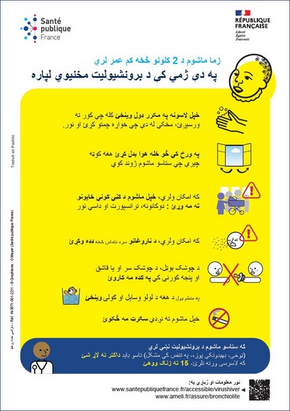 Comment éviter la bronchiolite pour les enfants de moins de 2 ans ? Affiche imagée élaborée avec des professionnels intervenant auprès de personnes vulnérables. Texte en pachto.