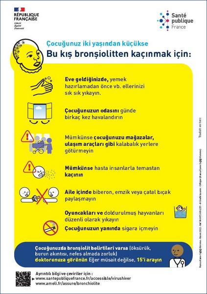 Comment éviter la bronchiolite pour les enfants de moins de 2 ans ? Affiche imagée élaborée avec des professionnels intervenant auprès de personnes vulnérables. Texte en turc.