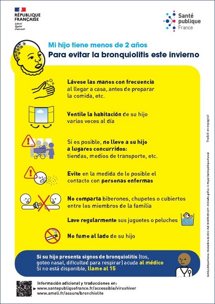 Comment éviter la bronchiolite pour les enfants de moins de 2 ans ? Affiche imagée élaborée avec des professionnels intervenant auprès de personnes vulnérables. Texte en espagnol.