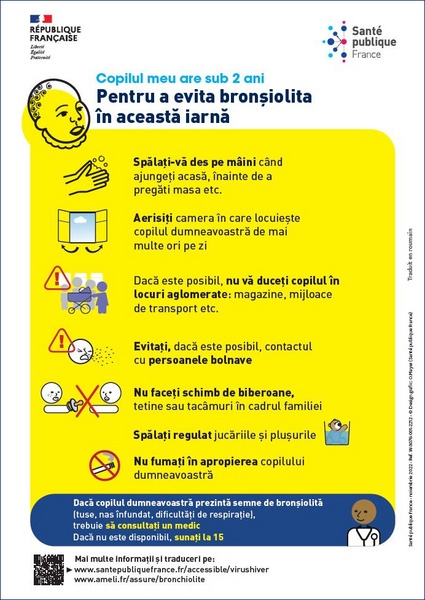 Comment éviter la bronchiolite pour les enfants de moins de 2 ans ? Affiche imagée élaborée avec des professionnels intervenant auprès de personnes vulnérables. Texte en roumain.