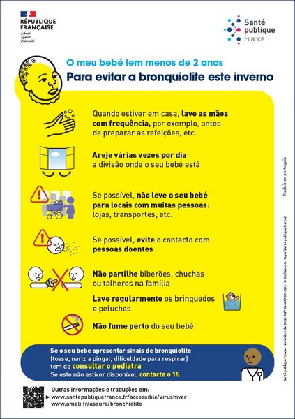 Comment éviter la bronchiolite pour les enfants de moins de 2 ans ? Affiche imagée élaborée avec des professionnels intervenant auprès de personnes vulnérables. Texte en portugais.