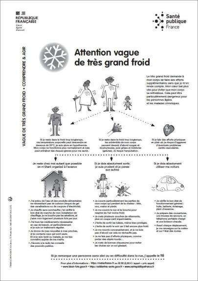 Cette affiche utilisable par tout type de professionnel de santé, par les associations, les mairies et tout lieu recevant du public vise à informer le grand public sur les risques liés au très grand froid et propose d'adopter de bonnes pratiques pour mieux vivre les périodes de conditions météorologiques exceptionnelles.