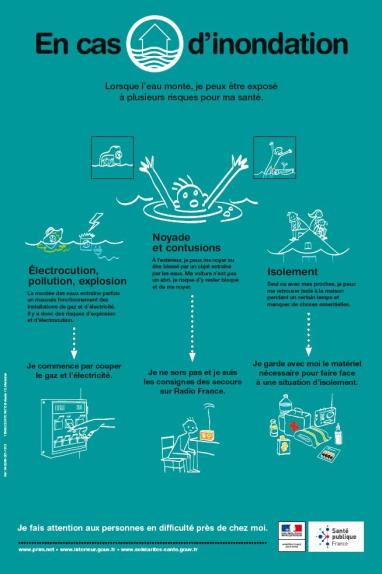 Cette affiche informe sur la conduite à tenir afin de prévenir les risques encourus en période d'inondation.