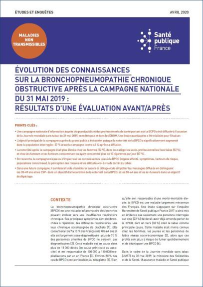 The main objective of the 2019 national public awareness campaign targeting the general public and healthcare professionals regarding BCPO was to raise awareness of this disease and its link to smoking, particularly among smokers and former smokers, so that they would discuss it with their doctors and to promote early diagnosis. A secondary objective was to encourage smokers to quit, as this preventive measure is the first line of treatment for this disease. The key findings from the pre-post evaluation study are as follows: The primary objective of the public awareness campaign was achieved, as awareness of COPD increased significantly among the surveyed population: 37% before the campaign versus 43% after its launch; Awareness after the campaign was higher among women (52%), in higher socioeconomic groups (52%), and among smokers and former smokers who currently smoke or have smoked more than 10 cigarettes per day (47%); However, the campaign had no impact on knowledge related to COPD (affected organs, symptoms, risk factors, affected populations), risk perception, or attitudes toward smoking cessation; In a future campaign, it would be useful to further refine the targeting and simplify the messages by distinguishing between 35- to 49-year-olds and lower socioeconomic groups to raise awareness of COPD, and between 50- to 64-year-olds and former smokers to promote screening.