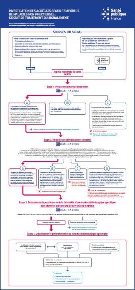 This flowchart outlines, in four steps, the process followed when a suspected cluster of non-infectious diseases (cancers, degenerative diseases, chronic inflammatory diseases, congenital malformations, etc.) is reported to public health agencies: 1) Handling of the report; 2) Analysis of the spatiotemporal cluster; 3) Assessment of the relevance and feasibility of a specific epidemiological study to identify the factors contributing to the cluster; 4) Organization and planning of the specific epidemiological study.