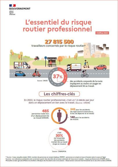 The publication of key figures and more detailed information on occupational road traffic risks in France is intended to mobilize industry sectors, companies, employee representatives, employees themselves, and all stakeholders in the field of prevention to improve the way these risks are addressed. This five-page summary presents key figures (2022) on the causes of workplace fatalities in a dashboard format (infographics, tables, etc.). It aims to raise awareness among company stakeholders and improve preventive measures. It is the result of a collaboration between various ministries (Labor, Health, Interior), the CNAM, the MSA, Santé publique France, and the National Interministerial Observatory for Road Safety (ONISR). The compiled indicators on occupational road risk are derived from the analysis of compensation data for workplace accidents and commuting accidents from the two main social security schemes mentioned above (the general scheme and the scheme for employees affiliated with the Mutualité sociale agricole), as well as data on traffic accidents resulting in bodily injury collected directly at the scene of the accident by law enforcement agencies and centralized by the ONISR. Statistical analysis of the causes and circumstances of work-related traffic accidents is an essential component for deepening our understanding of the risk, establishing an accurate diagnosis, and consequently guiding prevention policy. The key findings on occupational road risk indicate that each year, occupational road accidents (combining commuting accidents and work-related accidents) are the second leading cause of workplace fatalities in France. 485 people were killed during work-related travel in 2022. In addition to fatalities, these accidents can have serious consequences for employees’ health. They also disrupt business operations. This risk is thus identified as one of the priority risks in the fourth Occupational Health Plan (2021–2025) and as a priority in road safety policy.