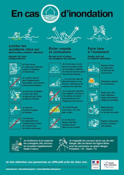 This flyer provides information on how to prevent risks during a flood and how to prevent risks after a flood. It urges people to be especially vigilant if there are elderly or disabled individuals in their community.