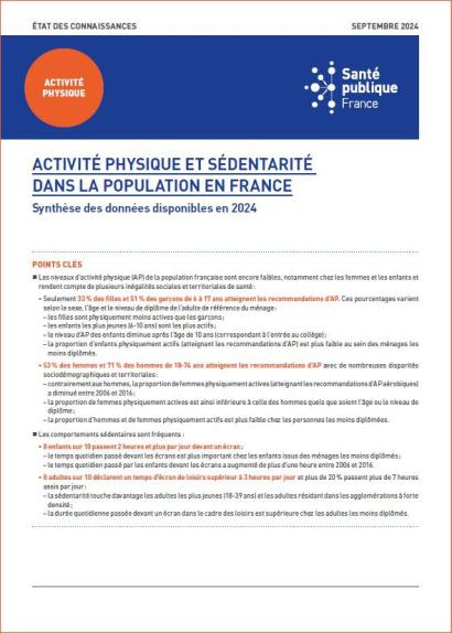 Physical activity (PA) levels among the French population remain low, particularly among women and children, and reflect several social and regional health inequalities: Only 33% of girls and 51% of boys aged 6 to 17 meet the PA recommendations. These percentages vary by gender, age, and the educational level of the household’s primary adult: – girls are less physically active than boys; – the youngest children (ages 6–10) are the most active; – children’s PA levels decline after age 10 (corresponding to the start of middle school); – the proportion of physically active children (meeting PA recommendations) is lower in households with the lowest educational attainment. 53% of women and 71% of men aged 18–74 meet PA recommendations, with significant sociodemographic and regional disparities: – unlike men, the proportion of physically active women (meeting aerobic PA recommendations) decreased between 2006 and 2016; – the proportion of physically active women is thus lower than that of men regardless of age or educational level; – the proportion of physically active men and women is lower among those with the lowest levels of education. Sedentary behaviors are common: 8 out of 10 children spend 2 hours or more per day in front of a screen; – daily screen time is higher among children from households with the lowest levels of education; – the daily time children spend in front of screens increased by more than one hour between 2006 and 2016. 8 out of 10 adults report more than 3 hours of leisure screen time per day, and over 20% spend more than 7 hours sitting per day: – sedentary behavior affects younger adults (ages 18–39) and adults living in high-density urban areas more; – the daily time spent in front of a screen for leisure purposes is higher among adults with the lowest levels of education.