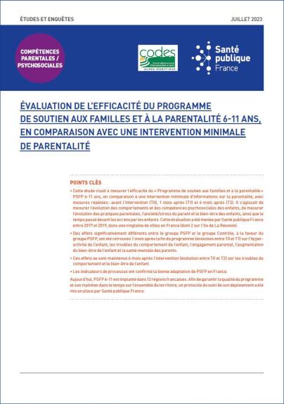 This study aimed to assess the effectiveness of the "Family and Parenting Support Program" (PSFP) for children aged 6–11, compared to a minimal intervention involving parenting information, using repeated measurements: before the intervention (T0), 1 month later (T1), and 6 months later (T2). The goal was to measure changes in children’s behaviors and psychosocial skills, changes in parenting practices, parental anxiety/stress and children’s well-being, as well as the amount of screen time spent by children. This evaluation was conducted by Santé publique France between 2017 and 2019 in approximately twenty cities across France (including two on the island of Réunion). Significantly different effects between the PSFP group and the Control group, favoring the PSFP group, were found one month after the end of the program (changes between T0 and T1) regarding children’s hyperactivity, children’s behavioral disorders, parental engagement, increased child well-being, and parents’ mental health. These effects persisted 6 months after the intervention (change between T0 and T2) regarding behavioral problems and the child’s well-being. Process indicators confirmed the successful adaptation of PSFP in France. Today, PSFP 6-11 is implemented in 12 French regions. To ensure the program’s quality and its long-term sustainability across the country, a protocol for monitoring its rollout has been established by Santé publique France.