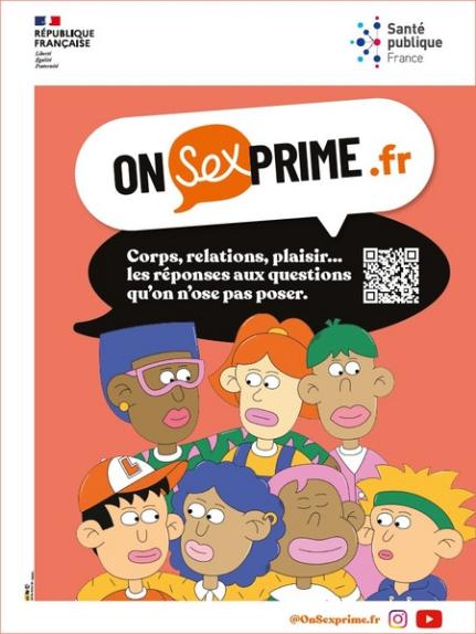 Poster for the OnSEXprime initiative featuring a QR code that links directly to the onsexprime.fr website. This document is intended for young people.