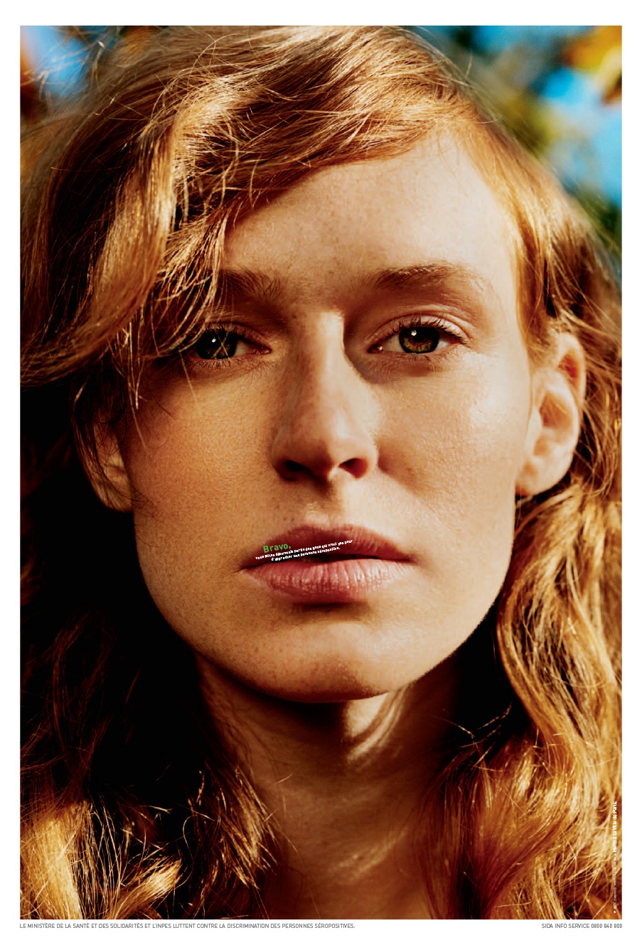 Poster advocating against discrimination against people living with HIV. The image encourages the viewer to look closely at a close-up of a face (in this case, a young redheaded woman) in order to...