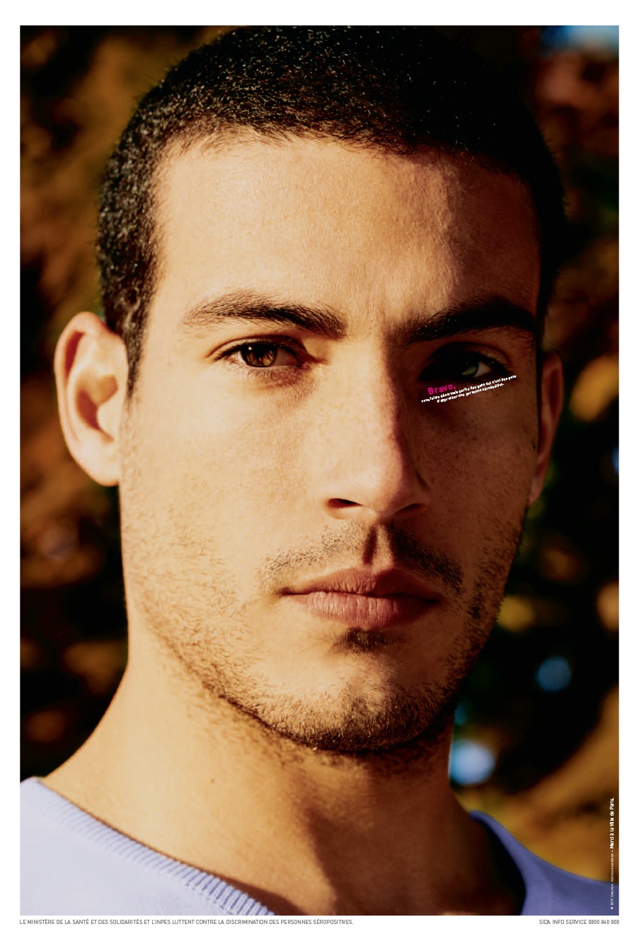 Poster advocating against discrimination against people living with HIV. The image encourages the viewer to look closely at a close-up of a face (in this case, a young person of North African...