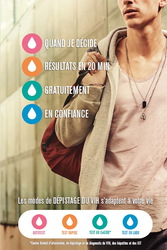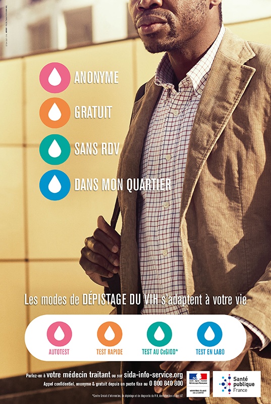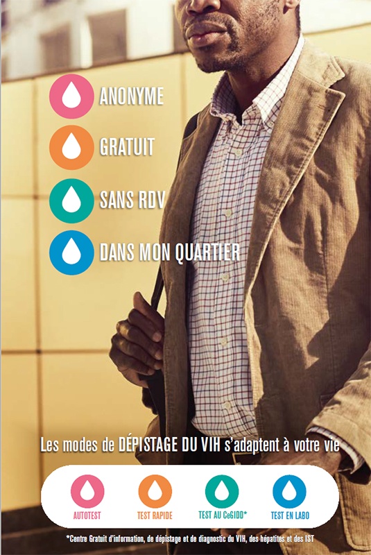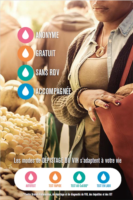 "Anonymous - Free - No appointment needed - In my neighborhood": The poster outlines the different ways to get tested for HIV: self-testing, rapid testing, testing at a Cegidd (Free Center for...