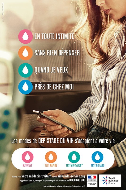 "In complete privacy—At no cost—Whenever I want—Close to home": The poster outlines the various methods of HIV testing: self-testing, rapid testing, testing at a Cegidd (Free Center for...