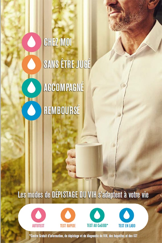 "At home—Without judgment—With support—Reimbursed": The poster outlines the various methods of HIV testing: self-testing, rapid testing, testing at a Cegidd (Free Center for Information, Testing,...