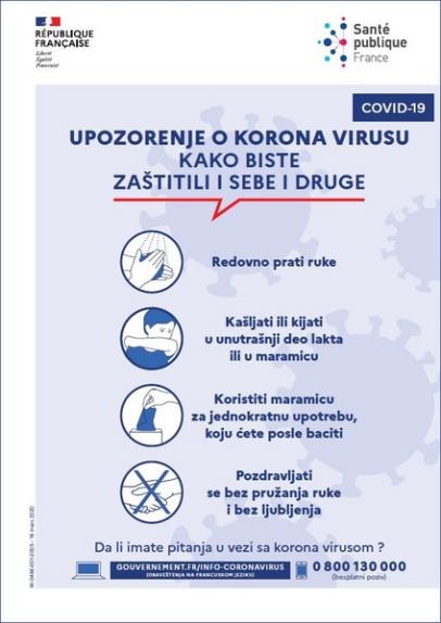 Cette affiche en serbe illustre les gestes à adopter pour se protéger et protéger les autres du coronavirus (Covid-19). Titre : Upozorenje o korona virusu : kako biste zaštitili i sebe i druge
