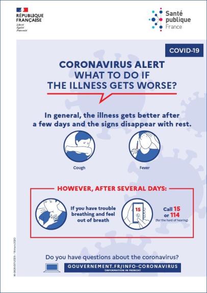 Cette affiche en anglais indique la conduite à tenir quand on ressent des symptômes graves de la maladie. Titre : Coronavirus alert : what to do if the illness gets worse?