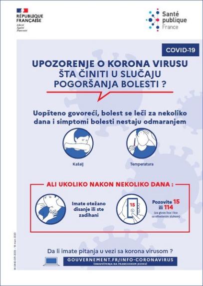 Cette affiche en serbe indique la conduite à tenir quand on ressent des symptômes graves de la maladie. Titre : Upozorenje o korona virusu : šta činiti u slučaju pogoršanja bolesti ?