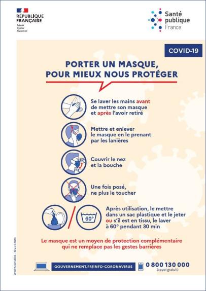 Cette affiche illustre les principales recommandations sur le port du masque grand public.