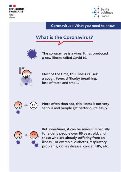 Cette fiche traduite en anglais s'adresse aux publics vulnérables, notamment aux personnes qui vivent en foyer ou autre lieu de vie collectif, en habitat précaire ou sans domicile. Elle explique simplement ce qu'est le coronavirus et comme il s'attrape.