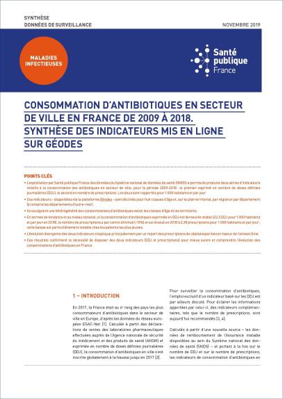 L'exploitation par Santé publique France des données du Système national de données de santé (SNDS) a permis de produire deux séries d'indicateurs relatifs à la consommation des antibiotiques en secteur de ville, pour la période 2009-2018. Ces indicateurs - disponibles via la plateforme Géodes - sont déclinés pour huit classes d'âge et, sur le plan territorial, par région et par département (y compris les départements d'outre-mer).
