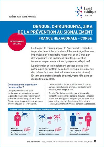 La dengue, le chikungunya et le Zika sont des maladies tropicales dues à des arbovirus. Elles sont régulièrement importées sur le territoire hexagonal et en Corse par des voyageurs (cas importés), où elles peuvent se transmettre par le moustique tigre (Aedes albopictus). La prévention et le signalement précoce de ces trois pathologies permettent de réduire le risque de survenue de chaînes de transmission locales (cas autochtones). Ce document à l'intention des professionnels de santé rappelle le mode de transmission de ces maladies et les principaux symptômes. Il présente les principaux messages de prévention, les tests biologiques à prescrire ainsi que le mode de signalement de ces maladies à déclaration obligatoire (liens vers les formulaires CERFA).