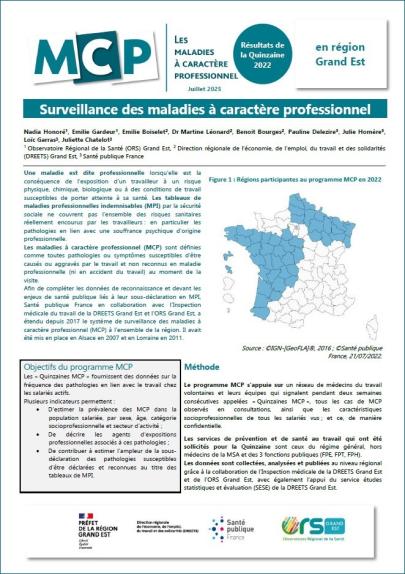 Dans le cadre de sa mission de surveillance épidémiologique des risques professionnels, Santé publique France met en place, en collaboration avec l'Inspection médicale du travail (IMT) du Ministère du travail et les Observatoires régionaux des régions participantes, un dispositif de surveillance épidémiologique des maladies à caractère professionnel (MCP). Le programme repose sur la participation volontaire de médecins du travail et de collaborateurs médecins de la région, qui signalent pendant deux semaines consécutives dites "Quinzaines MCP", toutes les MCP rencontrées au cours de leurs consultations auprès des travailleurs., avec l'appui des infirmières et infirmiers. Cette plaquette présente les résultats de l'unique Quinzaine réalisée au cours de l'année 2022 dans la région Grand Est.