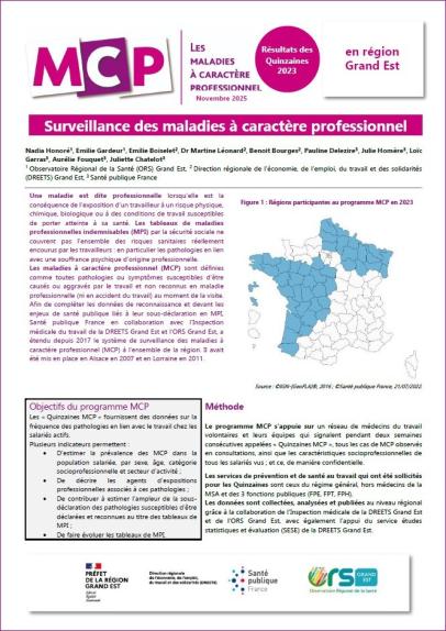 Dans le cadre de sa mission de surveillance épidémiologique des risques professionnels, Santé publique France met en place, en collaboration avec l'Inspection médicale du travail (IMT) du Ministère du travail et les Observatoires régionaux des régions participantes, un dispositif de surveillance épidémiologique des maladies à caractère professionnel (MCP). Le programme repose sur la participation volontaire de médecins du travail et de collaborateurs médecins de la région, qui signalent pendant deux semaines consécutives dites "Quinzaines MCP", toutes les MCP rencontrées au cours de leurs consultations auprès des travailleurs., avec l'appui des infirmières et infirmiers. Cette plaquette présente les résultats des Quinzaines réalisées au cours de l'année 2023 dans la région Grand Est.