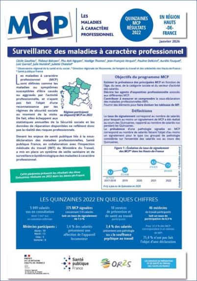 Dans le cadre de sa mission de surveillance épidémiologique des risques professionnels, Santé publique France a mis en place, en partenariat avec l'Inspection médicale du travail (IMT) du Ministère du Travail, un dispositif de surveillance épidémiologique des MCP. En Hauts-de-France, le programme est mené conjointement entre Santé publique France, l'IMT de la Direction régionale de l'économie, de l'emploi, du travail et des solidarités (Dreets) et l'observatoire régional de la santé et du social (OR2S). Il repose sur la participation volontaire de médecins du travail et de collaborateurs médecins de la région, qui signalent deux fois par an, avec l'appui des infirmier(ère)s. Cette plaquette présente les résultats des Quinzaines réalisées au cours de l'année 2022 dans la région.