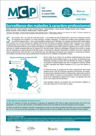 Dans le cadre de sa mission de surveillance épidémiologique des risques professionnels, Santé publique France a mis en place, en partenariat avec l'Inspection médicale du travail (IMT) du Ministère du Travail, un dispositif de surveillance épidémiologique des MCP. Ce programme national, débuté en 2003, regroupait sept régions françaises en 2017, puis neuf régions en 2018. En Hauts-de-France, le programme est mené conjointement entre Santé publique France, l'IMT de la Direction régionale de l'économie, de l'emploi, du travail et des solidarités (Dreets) et l'observatoire régional de la santé et du social (OR2S). Il repose sur la participation volontaire de médecins du travail et de collaborateurs médecins de la région, qui signalent deux fois par an, avec l'appui des infirmier(ère)s. Cette plaquette présente les résultats des trois Quinzaines réalisées au cours des années 2017 et 2018 dans la région.