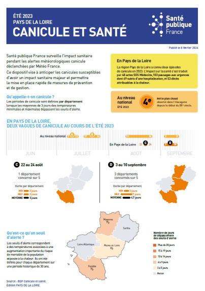 La région Pays de la Loire a connu deux épisodes de canicule en 2023. L'impact sur la santé s'est traduit par 48 actes SOS Médecins,103 passages aux urgences dont 69 suivis d'une hospitalisation, et 53 décès attribuables à la chaleur.