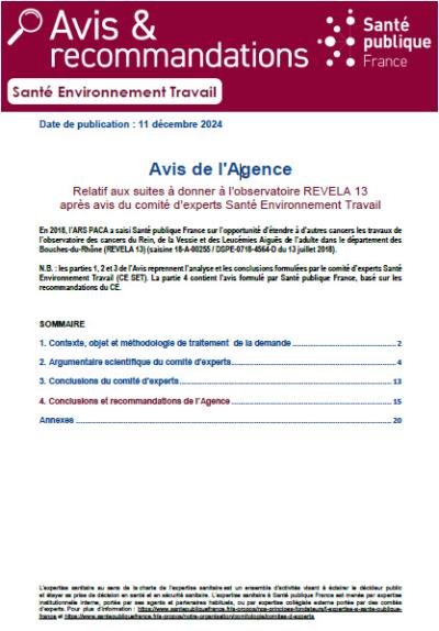 Avis de l'agence relatif aux suites à donner à l'observatoire REVELA 13 après avis du Comité d'experts santé environnement travail