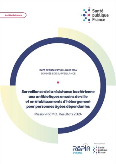 La mission PRIMO a pour objectif de surveiller et prévenir la résistance aux antibiotiques et les infections associées aux soins, en soins de ville et en secteur médico-social. Les données nationales 2024 de résistance aux antibiotiques en ville et en Ehpad portent sur trois espèces bactériennes d’intérêt (Escherichia coli, Klebsiella pneumoniae et Staphylococcus aureus). Du 1er janvier au 31 décembre 2024, les antibiogrammes de E. coli, K. pneumoniae et S. aureus isolés de prélèvements à visée diagnostique ont été collectés dans le réseau de 2 015 laboratoires de biologie médicale (LBM) répartis dans les 13 régions de France hexagonale et la Réunion. Les antibiogrammes des souches isolées des prélèvements de patients vivant à domicile ou de résidents d’Ehpad ont été inclus dans l'analyse. Les prélèvements de dépistage et des établissements de santé étaient exclus. Les proportions de résistance aux antibiotiques ont été calculées aux niveaux national et régional, notamment pour les céphalosporines de 3e génération (C3G), les carbapénèmes et les fluoroquinolones (FQ), avec description des tendances, comparaison entre les souches sensibles et résistantes aux C3G, proportions de souches sensibles et résistantes à un ou plusieurs antibiotiques (bactéries multirésistantes) et incidence. Des analyses statistiques ont été effectuées en utilisant le test de Student ou une analyse de variance. En 2024, 962 944 antibiogrammes réalisés sur les souches des Enterobacterales isolées de prélèvements urinaires ont été recueillis (dont 83,4% de E. coli et 11,5% de K. pneumoniae). Chez les patients vivant à domicile, 4,3% des isolats de E. coli étaient résistantes aux C3G et 3,7% par production de bêta-lactamase à spectre étendu (BLSE). Au sein de la population des résidents en Ehpad, la résistance aux C3G concernait 8,9% des souches de E. coli et 7,8% par production de BLSE. La résistance aux FQ chez E. coli était de 10,8% pour les souches isolées de patients à domicile et de 14,2% pour celles isolées de résidents d’Ehpad. Chez K. pneumoniae, la production de BLSE concernait 7,9% des souches isolées de patients à domicile et 20,0% de celles isolées chez des résidents d’Ehpad, tandis que 10,4% des souches étaient résistantes aux FQ chez les patients vivant à domicile et 20,5% chez les résidents d’Ehpad. Chez les patients à domicile, 375 souches de E. coli et 155 souches de K. pneumoniae produisaient une carbapénémase et en Ehpad, 18 souches de E. coli et 12 souches de K. pneumoniae. Pour S. aureus, 42 363 antibiogrammes ont été inclus (hors urines) avec 6,1% des souches résistantes à la méticilline isolées chez les patients vivant à domicile et 35,4% en Ehpad. En 2024, le pourcentage de souches urinaires de E. coli productrices de BLSE était au plus haut depuis 2017 (3,4%) en soins de ville et avait également augmenté en Ehpad. En revanche, la résistance aux FQ a diminué en soins de ville comme en Ehpad. Même si le nombre des Enterobacterales productrices de carbapénémases isolé de prélèvements à visée diagnostique restait faible en 2024, leur augmentation régulière est à surveiller. La fosfomycine comme la nitrofurantoïne conservaient une bonne efficacité sur les souches de l’espèce E. coli dans les deux secteurs.