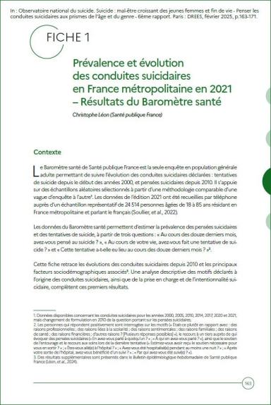Cette fiche, issue du 6ème rapport de l'Observatoire national du suicide (ONS), retrace les évolutions des conduites suicidaires depuis 2010 et les principaux facteurs sociodémographiques associés. Une analyse descriptive des motifs déclarés à l'origine des conduites suicidaires, ainsi que de la prise en charge et de l'intentionnalité suicidaire, complètent ces premiers résultats. Les données sont issues du Baromètre santé de Santé publique France. Citation : Léon C. Prévalence et évolution des conduites suicidaires en France métropolitaine en 2021 - Résultats du Baromètre santé. In : Observatoire national du suicide. Suicide : mal-être croissant des jeunes femmes et fin de vie - Penser les conduites suicidaires aux prismes de l'âge et du genre - 6ème rapport. Paris : DREES, février 2025, p.163-171. Le 6ème rapport de l'ONS est téléchargeable sur le site de la DREES (https://www.drees.solidarites-sante.gouv.fr).