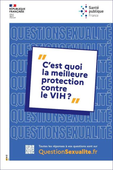 Editée à l'occasion de la semaine de la santé sexuelle 2023, cette affiche incite à consulter le site QuestionSexualite.fr pour s'informer sur les moyens de protection contre le VIH. Accroche : "C'est quoi la meilleure protection contre le VIH ?". Ce document est à destination des adultes.