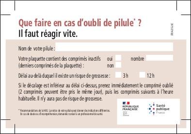 La carte " Que faire en cas d'oubli de pilule ? " est conçue comme un outil de dialogue entre le professionnel et sa patiente. Elle décrit la conduite à tenir en cas d'oubli de pilule. Les professionnels pourront la remettre lors de la prescription ou de la délivrance de la pilule en précisant le nom de la pilule utilisée, le cas échéant, le nombre de comprimés placebos, et le délai au-delà duquel il existe un risque de grossesse. Son format carte de crédit en fait un aide-mémoire facile à conserver avec soi pour les femmes.