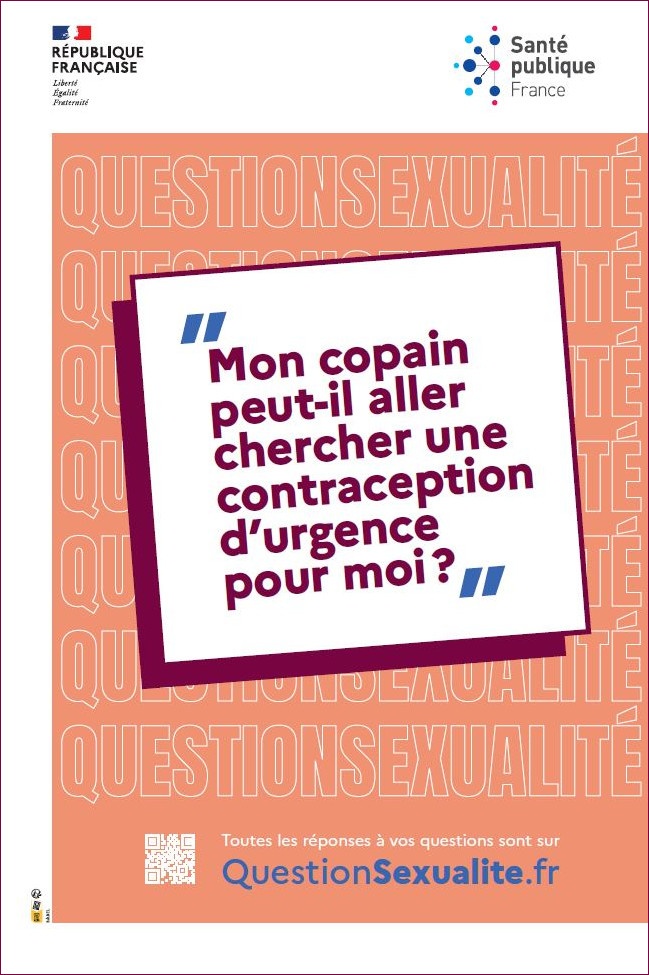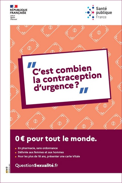 Editée à l'occasion de la semaine de la santé sexuelle 2023, cette affiche précise les conditions de la gratuité de la contraception d'urgence. Accroche : "C’est combien la contraception d’urgence...