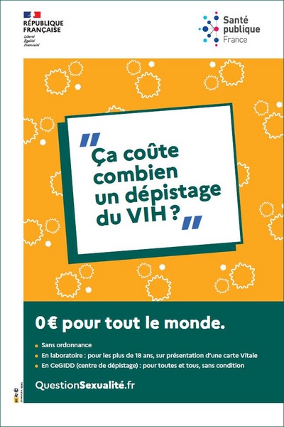 Editée à l'occasion de la semaine de la santé sexuelle 2023, cette affiche précise les conditions de la gratuité du dépistage du VIH. Accroche : "Ça coûte combien un dépistage du VIH ?". Ce...