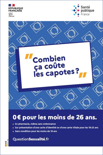 Editée à l'occasion de la semaine de la santé sexuelle 2023, cette affiche précise les conditions de la gratuité des préservatifs pour les moins de 26 ans. Accroche : "Combien ça coûte les capotes...