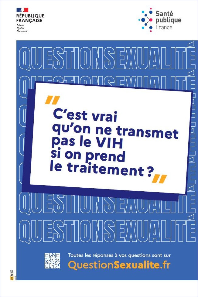 Editée à l'occasion de la semaine de la santé sexuelle 2023, cette affiche incite à consulter le site QuestionSexualite.fr pour s'informer sur le Traitement comme Prévention (TasP), traitements...