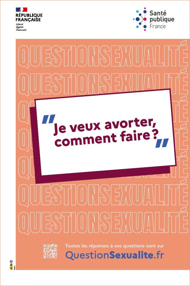 Editée à l'occasion de la semaine de la santé sexuelle 2024, cette affiche incite à consulter le site QuestionSexualite.fr pour s'informer sur l'IVG. Accroche : "Je veux avorter, comment faire...