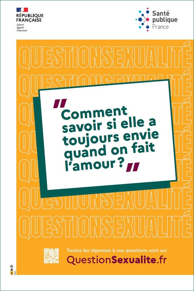 Editée à l'occasion de la semaine de la santé sexuelle 2023, cette affiche incite à consulter le site QuestionSexualite.fr pour s'informer sur le consentement. Accroche : "Comment savoir si elle a...