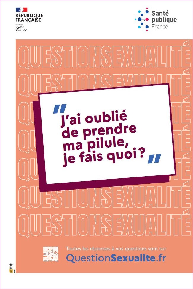Editée à l'occasion de la semaine de la santé sexuelle 2023, cette affiche incite à consulter le site QuestionSexualite.fr pour s'informer sur la contraception. Accroche : ""J'ai oublié de prendre...