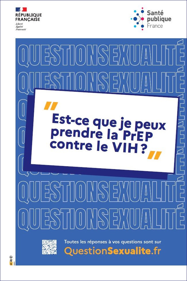 Editée à l'occasion de la semaine de la santé sexuelle 2023, cette affiche incite à consulter le site QuestionSexualite.fr pour s'informer sur la Prophylaxie Pré-Exposition (PrEP), traitement...