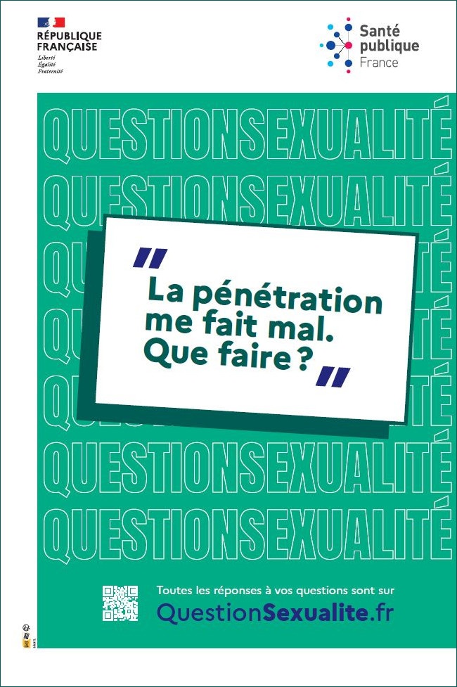 Editée à l'occasion de la semaine de la santé sexuelle 2023, cette affiche incite à consulter le site QuestionSexualite.fr pour s'informer sur les dyspareunies, douleurs liées à une pénétration....