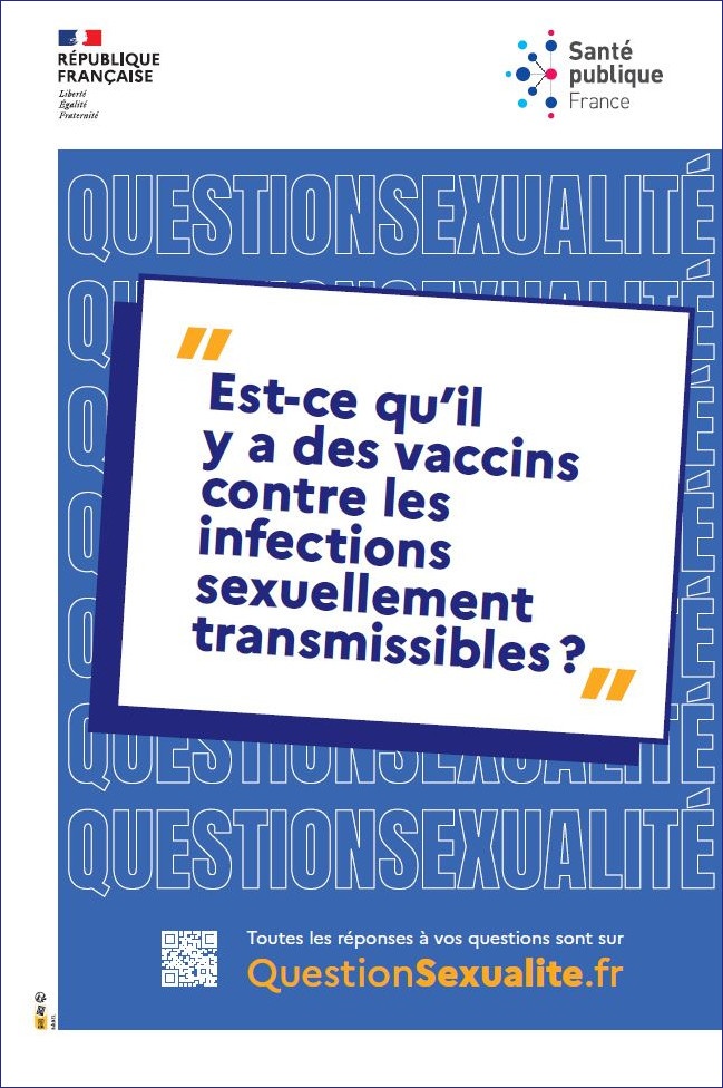 Editée à l'occasion de la semaine de la santé sexuelle 2023, cette affiche incite à consulter le site QuestionSexualite.fr pour savoir si les vaccins peuvent protéger des IST. Accroche : "Est-ce...