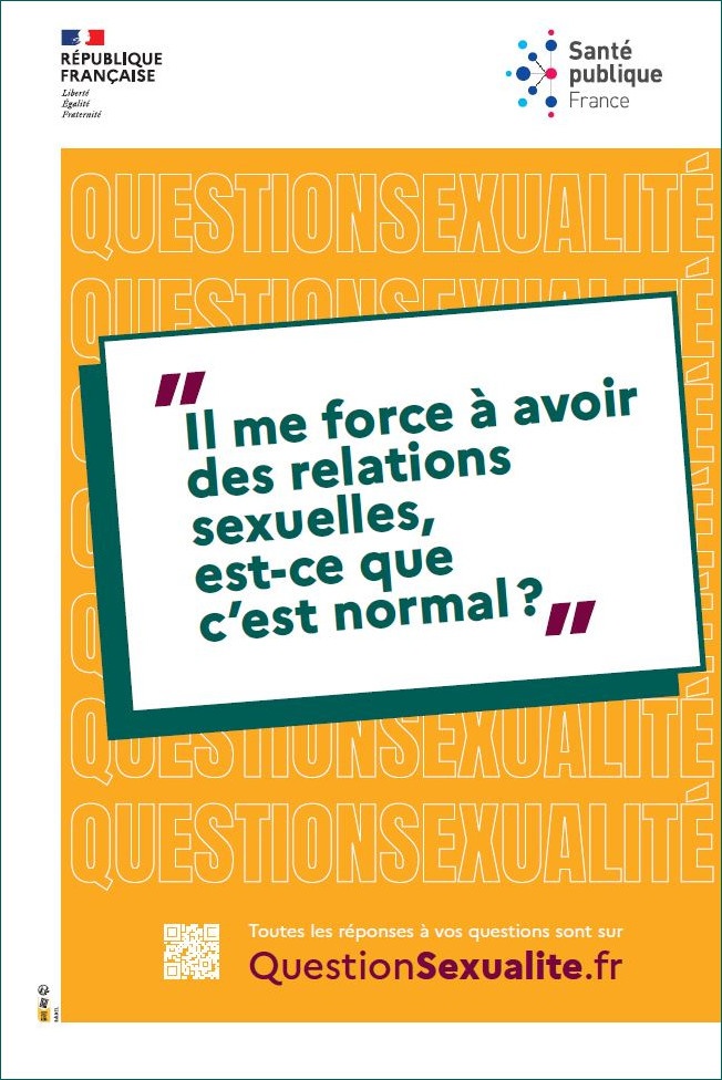 Editée à l'occasion de la semaine de la santé sexuelle 2023, cette affiche incite à consulter le site QuestionSexualite.fr pour s'informer sur les violences sexuelles. Accroche : "Il me force à...
