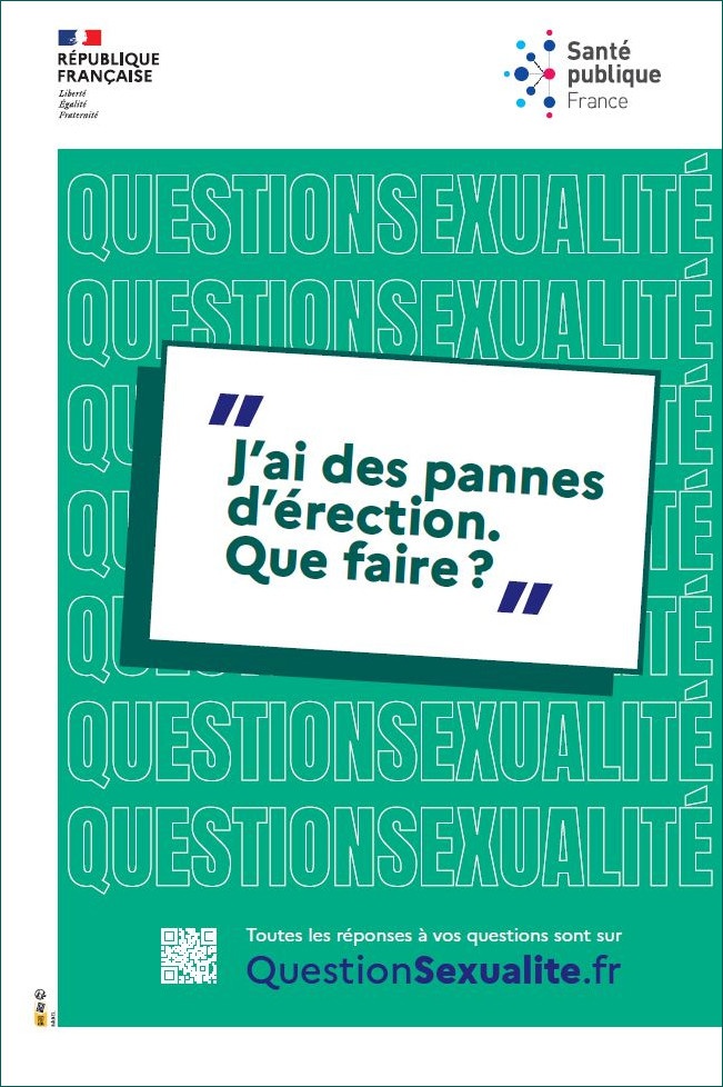 Editée à l'occasion de la semaine de la santé sexuelle 2023, cette affiche incite à consulter le site QuestionSexualite.fr pour s'informer sur les troubles érectiles. Accroche : "J'ai des pannes...