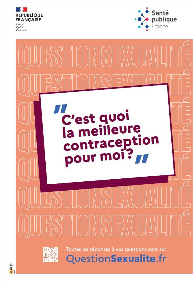 Editée à l'occasion de la semaine de la santé sexuelle 2023, cette affiche incite à consulter le site QuestionSexualite.fr pour s'informer sur tous les modes de contraception. Accroche : "C'est...